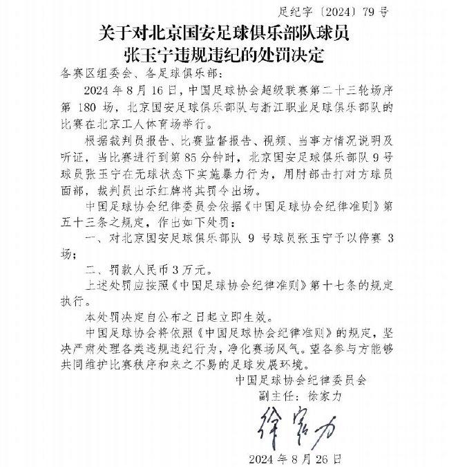 8月27日讯 足协官方公布处罚,张玉宁因在无球状态实施暴力行为,停赛3场,罚款3万。