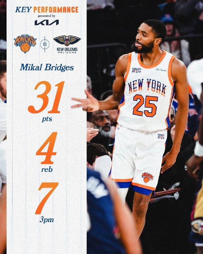 布里奇斯三分12中7轰下31分,率领尼克斯取得33分的大胜。