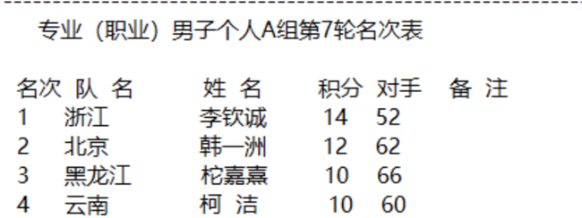 职业男子个人分为A、B两个小组,采用积分编排制,共记7轮比拼,取两组前4名进入决胜局比拼,各小组第一争夺第一、二名,各小组第二争夺第三、四名,各小组第三争夺第五、六名,各小组第四争夺第七、八名。