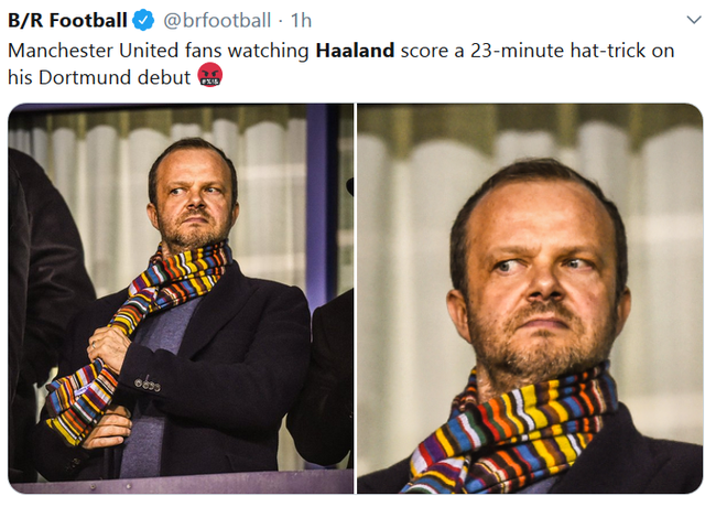 哈兰德第三球在哈兰德力助多特蒙德5-3赢奥格斯堡后,ESPN发出了一个表情包,寓意曼联球迷的心在滴血。而BR也发出了曼联CEO伍德沃德的表情包,一时间因为哈兰德,曼联被各种挖苦。