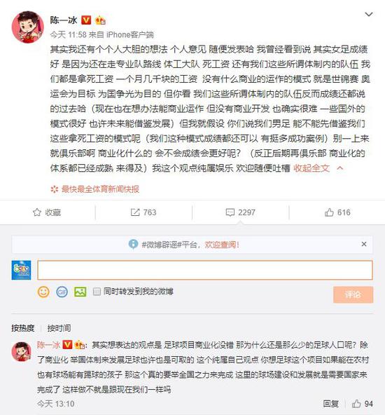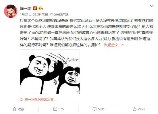 在国足0-1落后泰国的情况下,陈一冰发博,“如果连泰国??都能输 我觉得其实里皮的年薪我也可以拿的 反正我执教的话最多再多输几个球而已 结果都一样嘛[笑cry]睡了 不看了 晚安”