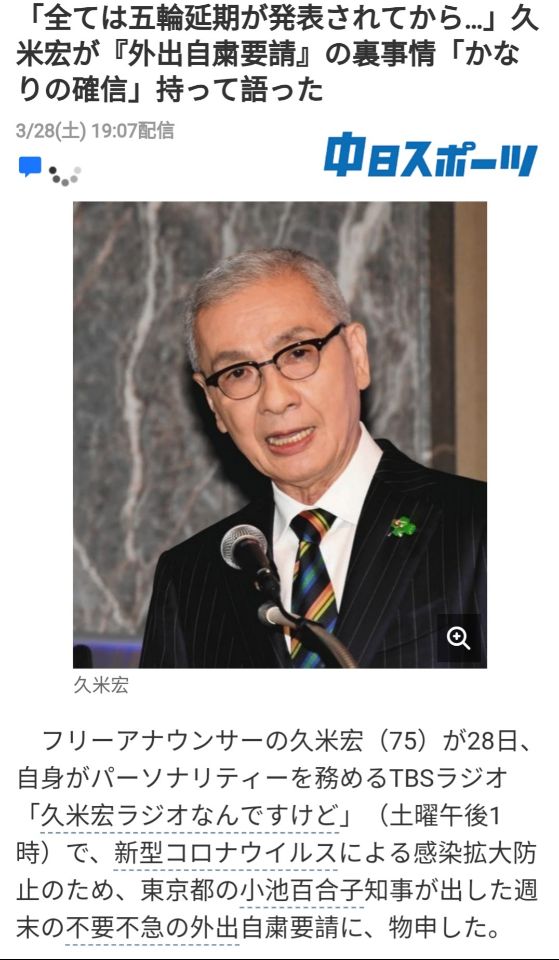 不过,日本著名媒体人久米宏在本周六(28日)自己的TBS电台广播节目中,发表了类似的看法,他说:“大家没觉得小池都知事要求大家在家里自我约束不外出,东京都一天感染新冠肺炎超过40人,超市都被买空了等等,这些事情都是在宣布奥运会延期之后才发生的吗?”