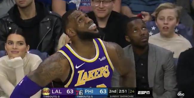 当时比赛进行到第二节还剩2分51秒,勒布朗-詹姆斯站在距离76人板凳席的不远处,并抬头看球场的大屏幕。