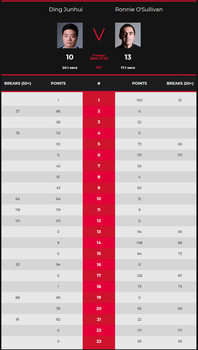 第23局,丁俊晖开局留下机会,奥沙利文毫不手软,单杆93分,再胜一局,以13-10拿下比赛。