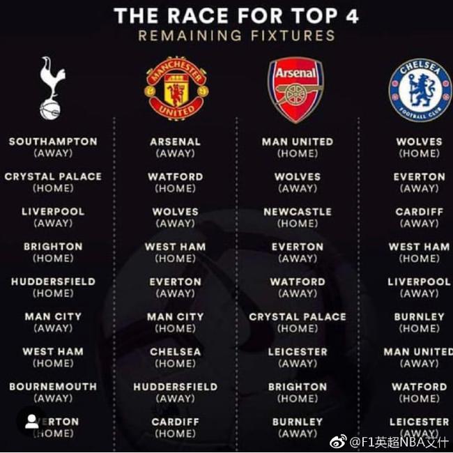 阿森纳赛程最优,天命所归?切尔西这一边的情况要比曼联好一些。一方面他们少赛一场,另一方面目前球队正在逐渐走向正轨。本轮战平狼队,也可以说是一个意外。狼队全场比赛只有1次射正,但就是进球了,而切尔西狂轰了22脚射门,也仅仅打入1粒进球。作为切尔西来说,最重要的还是球队锋无力的问题,如果伊瓜因能够在接下来8轮比赛当中,发挥出色的话,那么蓝军争四的希望还是相当大的。从赛程来看,切尔西最后8轮有两个对手是利物浦与曼联。