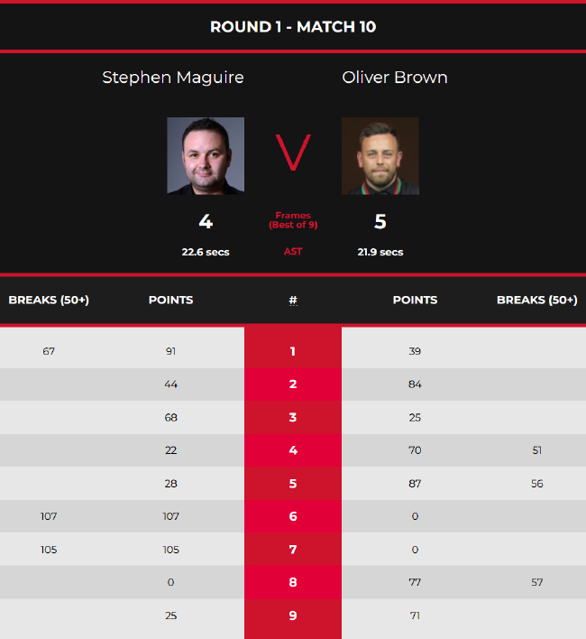 斯蒂芬-马奎尔4-5奥利弗-布朗在其它比赛中,苏格兰名将斯蒂芬-马奎尔在打出2杆破百并以大比分4-3拿到赛点的情况下,连丢3局,最终遗憾地以4-5被奥利弗-布朗翻盘,无缘正赛。