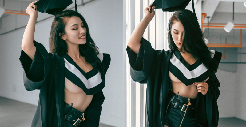 求學路佔據了人生一大部分,如今畢業當然要用最美嫩的肉體致一下青春,這位火辣美女【Effi】,一身黑色學士服大開衣襟,白色大V領巾下居然什麼都沒穿,露著鮮嫩欲垂的白皙南半球,短褲上還有著性感腰線,不只是男同學,連教授、教官還是校長都看了下巴落下、口水狂流!