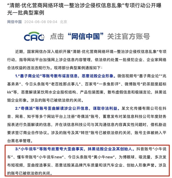 网信中国提到,近期,国家网信办深入组织开展“清朗·优化营商网络环境—整治涉企侵权信息乱象”专项行动,指导网站平台加强网上涉企信息内容管理,依法依约处置一批侵犯企业、企业家网络合法权益的违法违规行为。“小牛说车”等账号故意夸大歪曲事实,抹黑诋毁企业及其创始人。抖音账号“小牛说车”、懂车帝账号“小牛说车new”、今日头条账号“黄小牛new”,为博眼球、吸流量,多次发布短视频,歪曲捏造事实、恶意诋毁某品牌汽车质量和该汽车企业、创始人形象声誉。涉及的账号已被依法依约关闭。